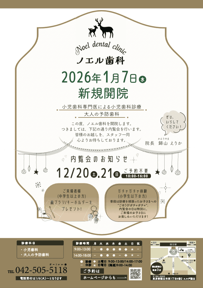 この度、2026年1月より、東京都国立市、国立駅南口徒歩3分の場所に「ノエル歯科」小児歯科、大人の予防歯科をオープンいたします。